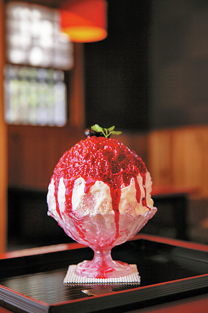 和モダンな甘味とかき氷の専門店。富士山の伏流水でていねいに手作りした氷を薄く削ったかき氷は、あと味がすっきりで口に入れた瞬間にスーッと消えていきます。旬のフルーツなどを使った手作りの濃厚ソースは、氷の中にもたっぷりかけられ、最後のひと口までおいしいと評判です。定番や季節のかき氷が10〜15種類ほど楽しめます。