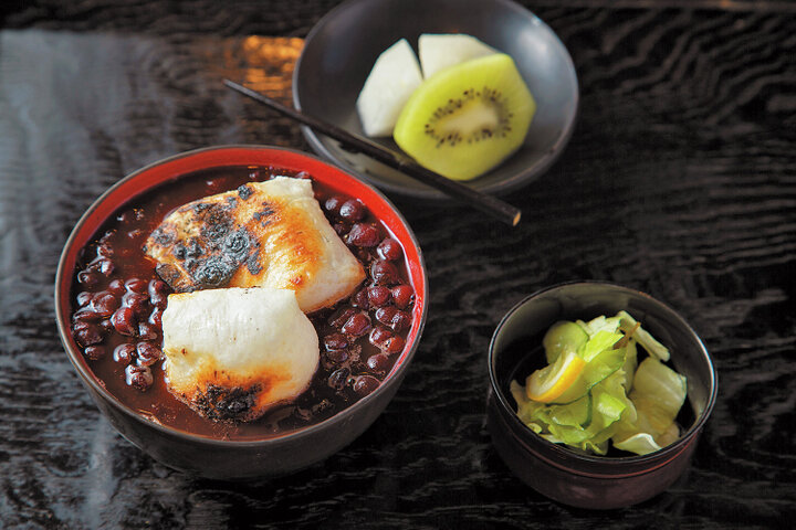 手作りの焼きたてのおもちが入った大納言しるこ1500円。果物と浅漬けが付く