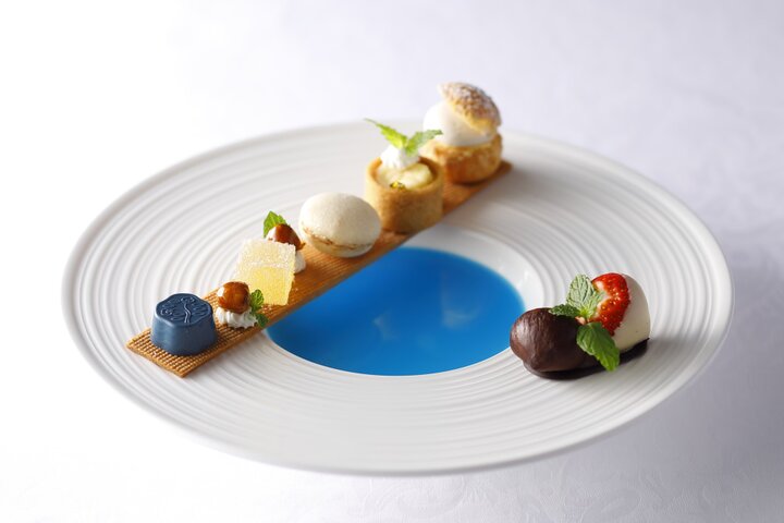 「資生堂パーラー 銀座本店サロン・ド・カフェ」では、資生堂パーラー創業当時に流行していた“新橋色”のデザートを、2022年10月1日~10月30日の平日限定・数量限定にて提供しています。 「新橋色のブランマンジェとプティフール 」は、コーヒーまたは紅茶またはハーブティー/カップサービスが付いています。 お皿中央にはブルーキュラソで“新橋色”をイメージし、中にはブランマンジェが潜んでいます。サブレのシートの上に、キャラメルとハチミツの入ったショコラ、りんごのパート・ド・フリュイ、洋ナシのマカロン、チーズケーキ、マロンのプティシューが整列。ひと口ずつ色々と楽しむことができるデザートです。