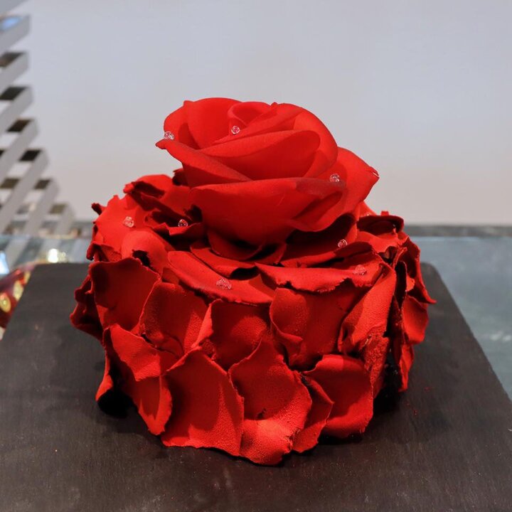 シェフパティシエ・石和悟さんが手がける今年のクリスマスケーキは、マリオットの原点であるレッドにこだわった5種類のケーキ。その中で一際華やかな「Rose(ローズ)」は、バラの花びらを模したチョコレートをパティシエが1枚1枚手作りで丁寧にデコレーションしたもの。 コク深いチョコレートの生地と、ほんのり酸味があるフランボワーズ、バラのクリームの層を重ね、真ん中にバラのジュレがサンドされているのがポイント。大切な方への贈り物に選んでみてはいかが。