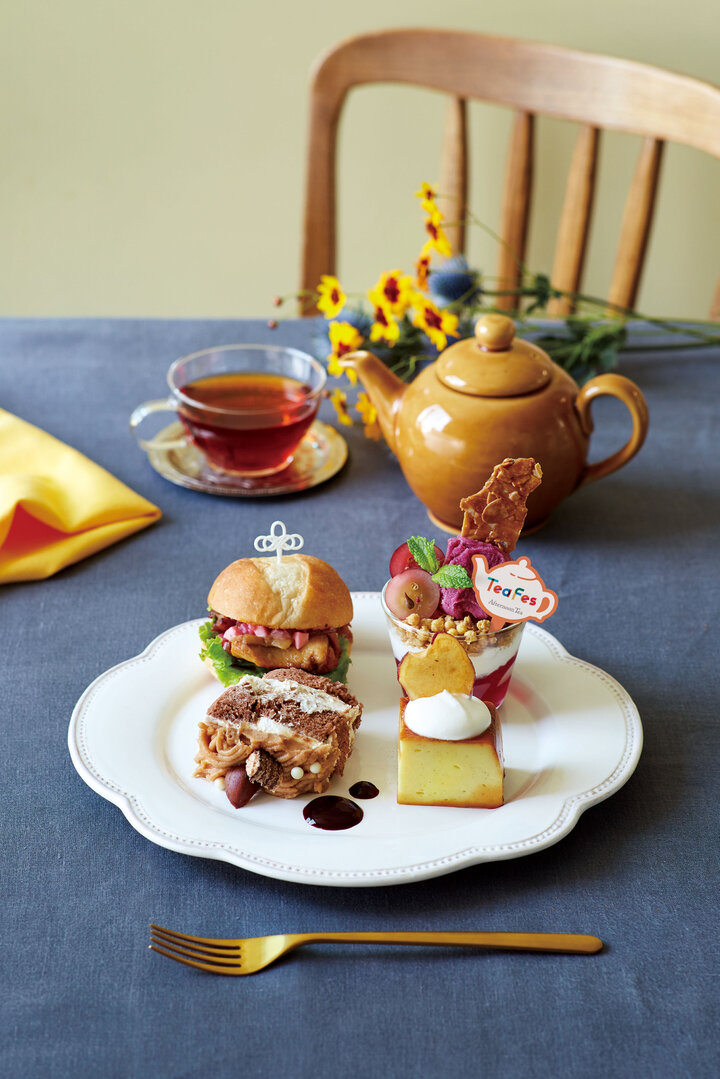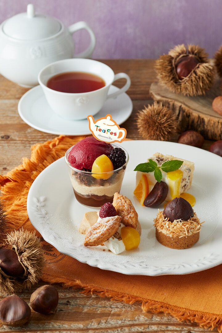ティーフェス記念スペシャルスイーツとして、栗×紅茶をテーマにしたアフタヌーンティーセット「栗と紅茶のスペシャルアフタヌーンティーセット」が登場します。 季節限定スイーツ3品に加え、11種類の中からお好みのスイーツ1品を選ぶことができます。