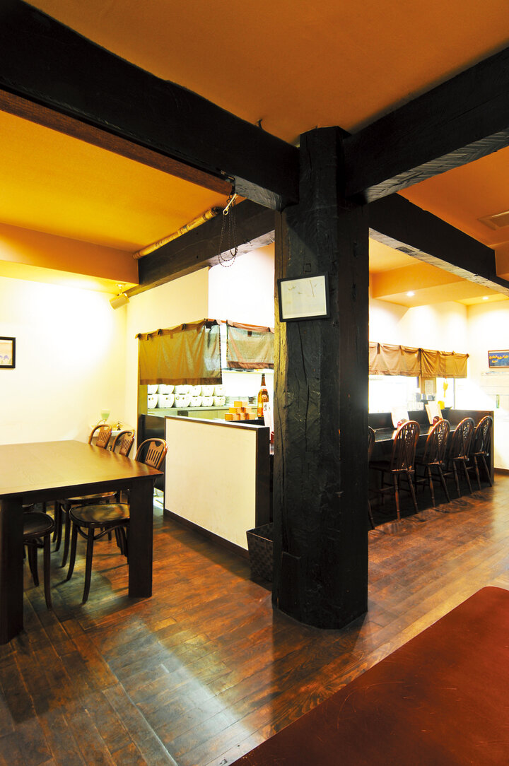 太い梁をめぐらした和モダンな雰囲気の店内でゆっくりくつろげる