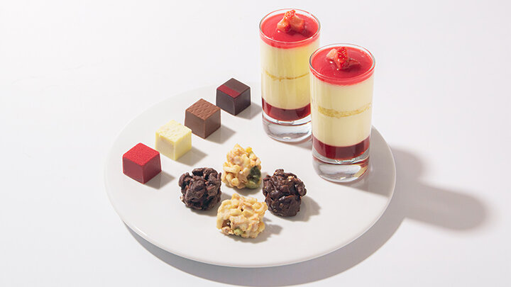 ■グラスケーキ「ブロードウェイ」 ※アフタヌーンティー限定 3種のチーズを贅沢に使用したムース、シェリービネガーで寝かせたイチゴのコンポート、オリーブオイルとレモンの皮を合わせた生地を重ねました。シェリービネガーの爽やかな風味と、クリーミーなチーズムースのハーモニーを楽しめます。 ■チョコレートアソート 幅広い味わいが楽しめるキューブ型のボンボンショコラ「キューブボンボン」と、粗く砕いたナッツやウエハースをチョコレートでコーティングしたクランチチョコレート「チョコロック」が用意されています。