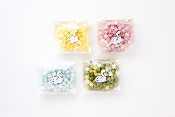 米どころ・新潟に古くから伝わるあられ菓子を、新しいフレーバーやカラフルな色で捉えなおした「浮き星」。現代の感性にフィットする愛らしいパッケージも魅力のひとつです。 中身があられのため軽く、コーティングシュガーのほのかな香りは、紅茶やコーヒーに浮かせて楽しんだり、一粒の優しいくちどけをじっくり味わったりとさまざまな楽しみ方ができますよ。