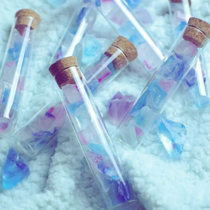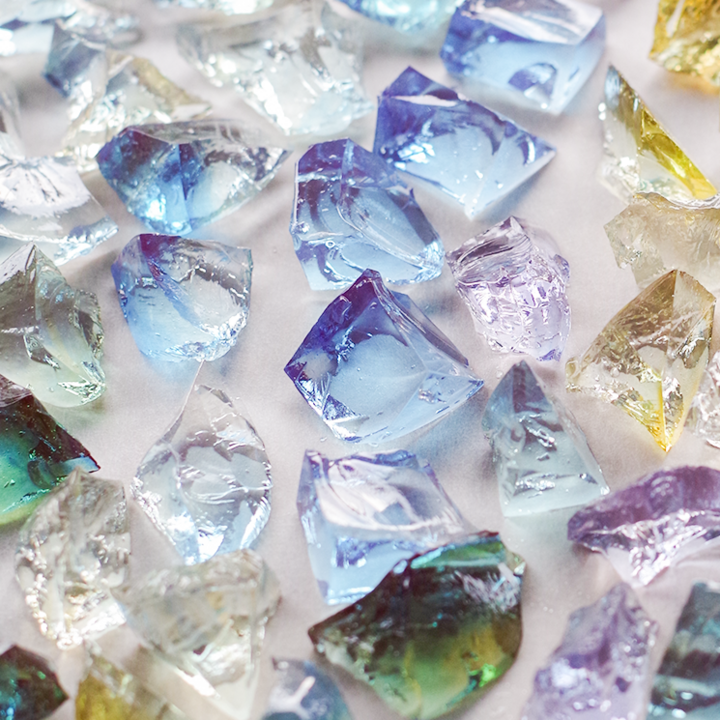魔法の琥珀糖の一番の特徴は、一粒ひとつぶ手で成型していることです。 断面がランダムになることで、宝石や鉱物に近い美しい見た目と、シャリっとした程よい食感に仕上げるためのこだわりです。