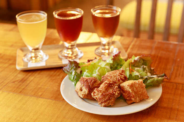 豊富なクラフトビールと合わせて楽しみたいフードメニューも充実しています。地元産の食材を使った小皿料理から数人でシェアできるピザなど、10~20種ほどのメニューを用意。 こちらは秩父麦酒を使った「自家製からあげ」。脂身の少ない鶏のムネ肉を使い、特製の麦酒タレに半日漬け込むことで柔らかく仕上げています。外の衣はサクサクながら、中はしっとりジューシー。しっかりした味付けでビールが進みます。