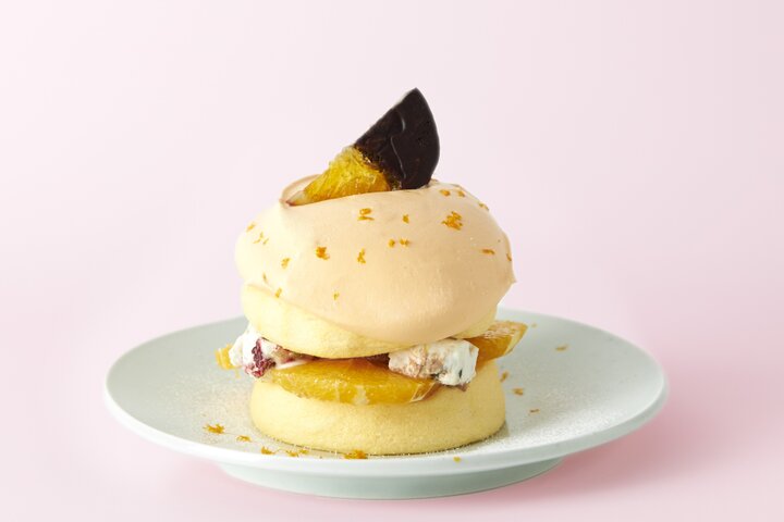 台湾「KISEKI PANCAKE ORANGE & CHOCOLATE/奇跡のパンケーキ オレンジ&チョコレート」は、台湾で旬のフルーツ伊予間(イヨカン)を主役に、相性の良いチョコレートを合わせたパンケーキ。 ヨーロッパの伝統的なクリスマススイーツ「オレンジチョコレート」をインスピレーションに、ホワイトチョコレートを練りこんだフルーツ入りのアイスケーキとヴァローナ社のカカオ72%チョコレートを使用したチョコレートムースをサンドしています。 オレンジの風味がしっかり感じられるカラフルなオレンジクリームで仕上げました。