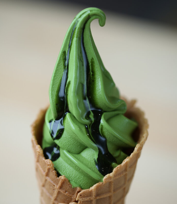 京都でたったひとつの村、南山城村の茶畑を望む「道の駅 お茶の京都 みなみやましろ村」では、村の人たちが大切に育てた特産品“村茶”を使った濃いお茶のスイーツが、SNSでバズッて大人気に。最近では、口溶けがクリーミーな新商品のブリュレが登場するなど話題の道の駅です。 中でも注目は、春摘み抹茶をたっぷり使った“村抹茶ソフトクリーム”。春摘みならではのほのかな苦みと濃厚な旨みに、さらに“追い抹茶”のソースで抹茶尽くしな味わいです。鮮やかなグリーンが、お茶好きにはたまりません。