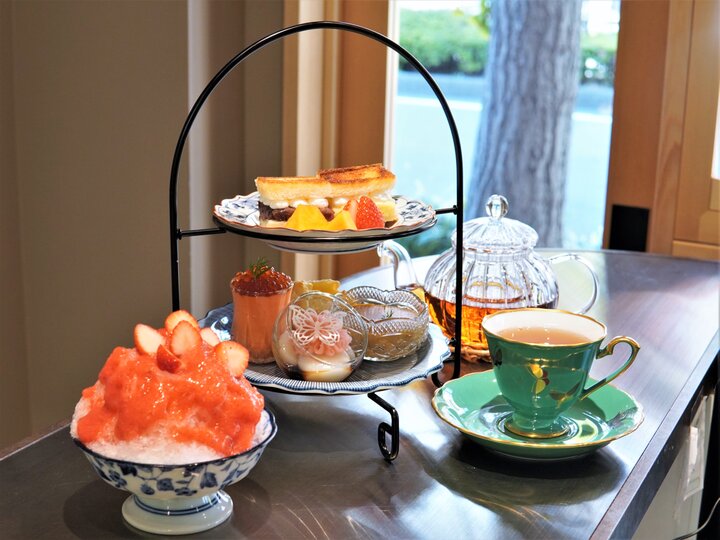 冬から春先にかけて「アフタヌーンティーセット」が期間限定で登場しました。本格的なセイボリーとサンドイッチ、甘味を盛り合わせた2段のスタンドを好きなドリンクで楽しみ、最後はミニサイズのかき氷で締める贅沢なセット。所々に和のテイストも盛り込まれていますよ。