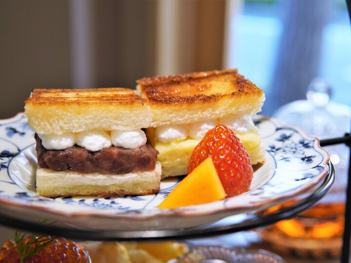 1段目のお皿は、特製ホイップクリームにあんことスイートポテトをはさんだサンドイッチです。特製ホイップクリームはかき氷にトッピングしているのと同じもので、香りづけにトンカビーンズを使っています。このビーンズは桜餅のような和の食材を連想する香りが漂い、あんことの相性も抜群。パンはバターをしみ込ませてこんがりと焼き、さらに表面をキャラメリゼしていて内側はしっとりとしながらも外はパリッとした食感です。和の風合いや食感を楽しみながら味わって。