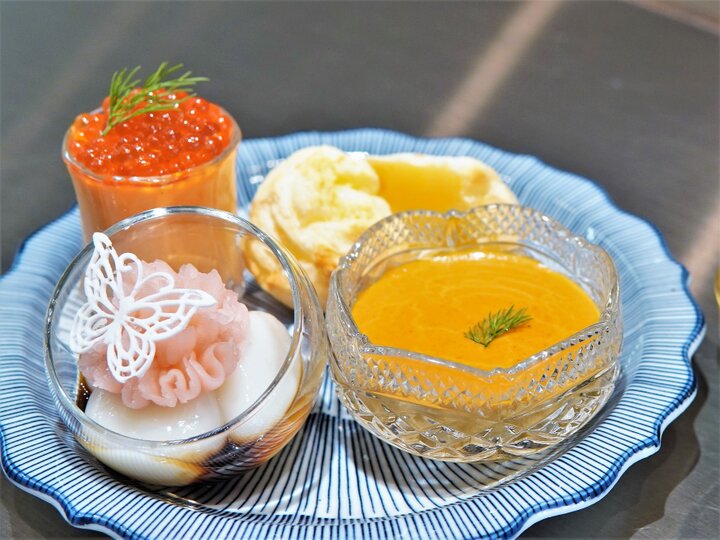 左からパプリカムースいくらのせ・お花のあんこと自家製白玉だんご・オマール海老のアメリケーヌカレー
