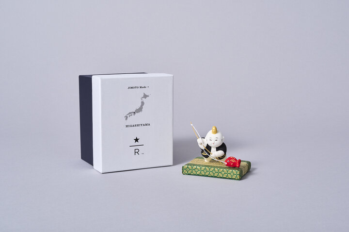 『JIMOTO Made + 東山 小御所人形 鯛釣り』は、小さな御所人形が「おめでたい」を釣り上げた様子を表現した人形です。鯛はお祝いのシーンに欠かせない縁起のよいものとして、人々の幸運を願いつくられました。 日本ならではの雰囲気を感じさせるように畳を使用した台に乗っています。