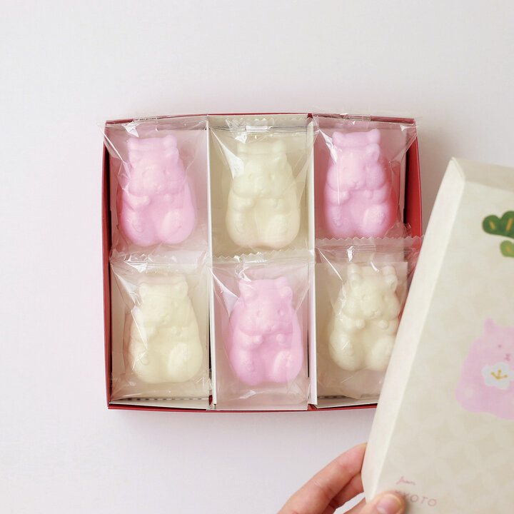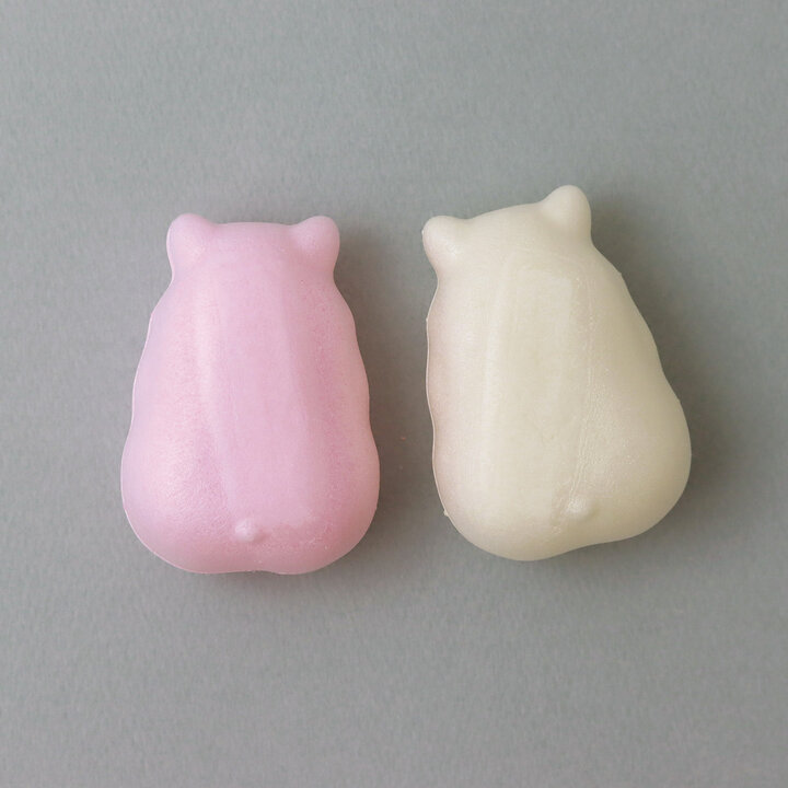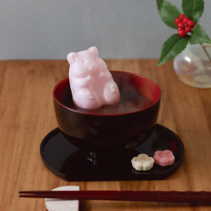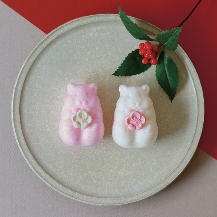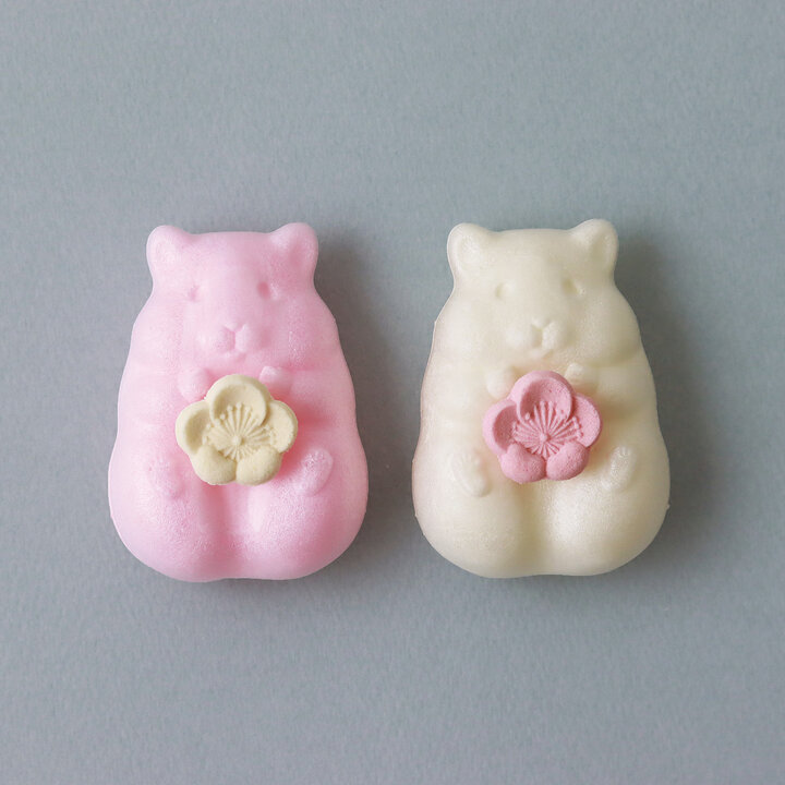 お正月バージョンのハムスターはピンクと白のおめでたい紅白カラーで、手に持たせるものは、梅型のらくがんです。 ハムスターのおなか部分が少しくぼんでいるので、付属の梅型のらくがんを一粒置いて召し上がれ。