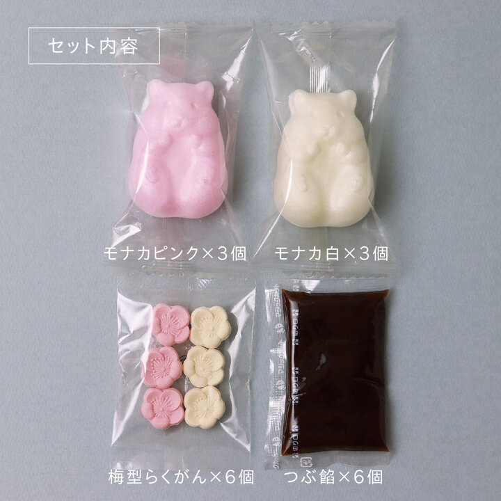 セット内容は、モナカ皮×6個(ピンク×3個、白×3個)、つぶ餡×6個、梅のらくがん×6個です。