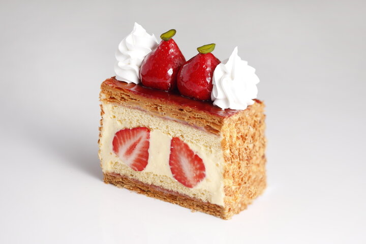 「あまおうナポレオンパイ」は、いちごと相性抜群なホテルニューオータニ特製カスタードを使用。 パイ生地とカスタードの間には、長崎県産「太陽卵」を使用したふわふわなスポンジ生地を挟みました。 サクサクのパイ生地、ふっくらとしたスポンジ生地のコンビネーションを楽しんで。