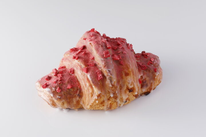 「あまおうクロワッサン」は、「博多あまおう(R)」を贅沢に5個分使用した濃厚なジュレを2層の生地でロールし、仕上げにあまおうのフリーズドライをトッピング。 まるで生のあまおうを食べているかのような、新感覚スイーツクロワッサンです。