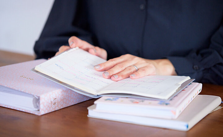島野:普段から2冊のノートを使い分けています。スケジュール管理をする手帳が1冊とスケジュール帳より詳しい記録を残すノートです。スケジュール帳は仕事、子ども、プライベートの3つの予定をペンの色で分けて書き込んでいます。パッと見て予定がわかるマンスリー手帳がお気に入りですね。