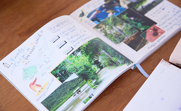 島野さん手作りの旅行ログ。色を使いすぎず、統一感を出すのがデコレーションのこだわりなのだとか。