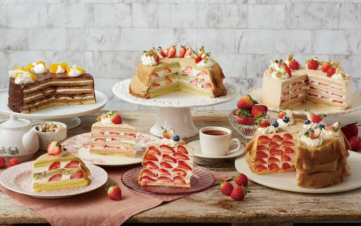 今回の冬の新作では、毎年いちごシーズンに発売しているプレミアムな5層仕立ての「苺のミルクレープ」、紅茶がふんわり香る「ストロベリーミルクティーのミルクレープ」をはじめ、ルミネ新宿、ルミネ横浜、静岡パルシェ、ルクア大阪の4店舗限定「オレンジとヘーゼルナッツのショコラミルクレープ」、ルクア大阪限定のテイクアウトクレープなどが期間限定で登場します。