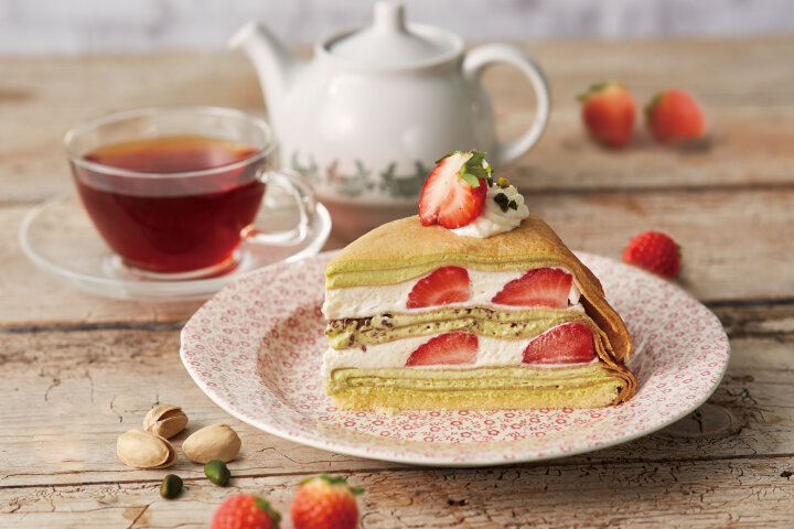 「苺とピスタチオのミルクレープ」は、ふんわりとした口当たりの香り高いピスタチオホイップと苺を重ね合わせました。チョコレートの食感がアクセントになっています。 【SIGNATURE】季節限定 ■商品名:苺とピスタチオのミルクレープ ■販売期間:2023年2月2日(木)~3月1日(水)※数量限定 ■販売店舗:全店
