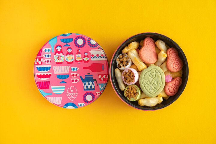麻布十番に本店があり、日本全国に店を構える揚げおかき専門店「あげもちCocoro」。なかでもおすすめは、カラフルな缶のなかにおかきとクッキーがギュッと詰まったミニ缶。開けると、色々な味と形のおかきの上にテントウム虫やクローバーなどのラッキーチャームを象った 米粉入りクッキーがお目見え。おかきの塩気とクッキーの甘さをひとつで味わえるのもうれしいですね。缶のデザインも中身も数種類から選べるので、好みのものをセレクトして。