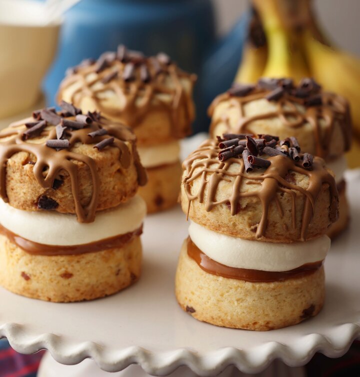 スコーンの本場でもある、イギリスの伝統菓子“ヴィクトリアケーキ”をイメージした「3種のベリーのヴィクトリアスコーンサンド」は、ミックスベリージャムとフレッシュ苺の甘酸っぱさが味わえるサクほろ食感のスコーンサンドです。ほろ苦いコーヒーの香りがアクセントの「バナナとトフィーのバノフィースコーンサンド」と共に、この冬は英国風のティータイムを提案します。