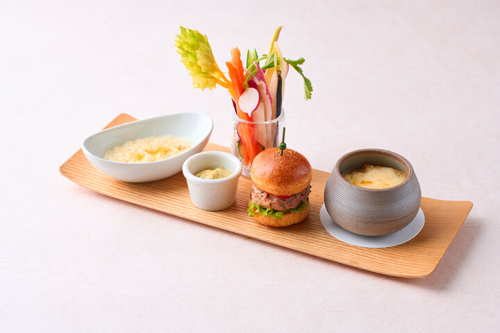 ■(奥から)チーズリゾット、野菜スティック バジルマヨネーズソース、ミニソイハンバーガー、オニオングラタンスープ 「カフェ」料理長 大滝実氏が監修したセイボリーは、「チーズリゾット」、「野菜スティック バジルマヨネーズソース」、「ミニソイハンバーガー」、「オニオングラタンスープ」の4品です。 すべて肉類と魚類を一切使用せず、卵や乳製品、野菜のみで調理しながら、ハンバーガーのジューシーさやオニオングラタンスープの濃厚なコクなどにこだわりました。 ボリュームがありながらさっぱりといただけるので、スイーツの箸休めにぴったりです。