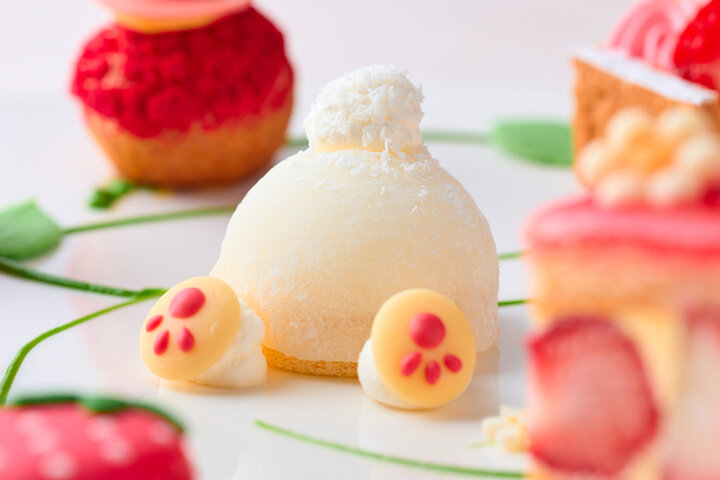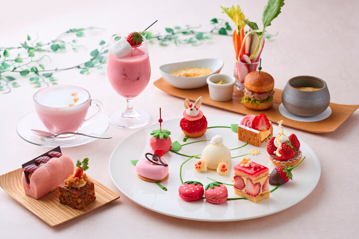■(左から)いちごミルク(アイス)、いちごラテ(ホット) 上に乗ったマシュマロといちごのトッピングやハートのラテアートが華やかなスペシャルドリンク2種は、ともにいちごの果実感と爽やかな酸味がバランスの良いいちごのピューレを牛乳に合わせました。 スイーツやセイボリーと一緒に楽しめるようさっぱりと仕上げています。その他にも、コーヒーや紅茶など豊富なドリンクをフリーフローで楽しむことができます。 * * * 詳細は、公式サイトをご覧ください。 2023年の干支「うさぎ」が跳びまわるスイーツプレートで、いちご狩り気分を楽しんでくださいね。