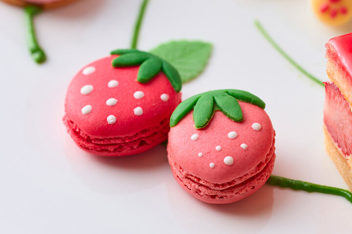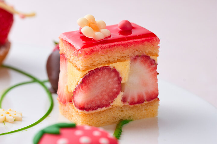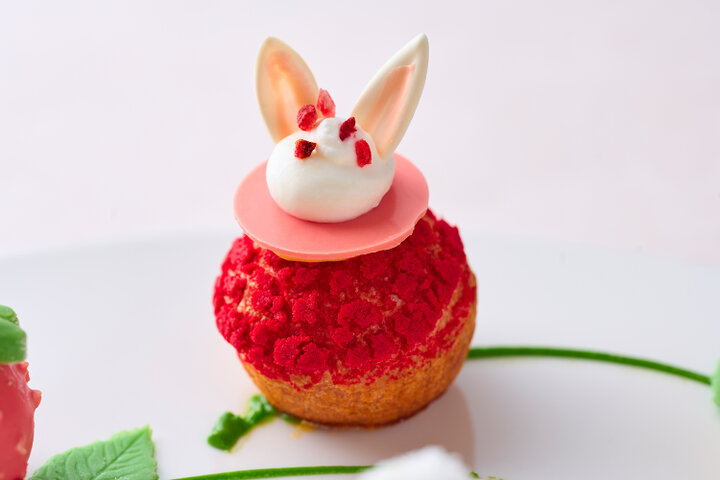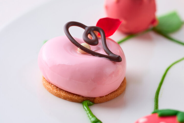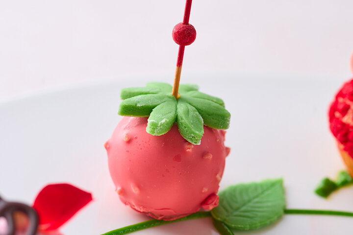■(上から)いちごのムースボール、いちごとラズベリーのマカロン、ヘタ付きいちごのチョコディップ 「いちごのムースボール」にはいちご風味のフロマージュムースにレモンの酸味を感じるジュレを閉じ込め、佐藤氏のスペシャリテである「いちごとラズベリーのマカロン」は甘酸っぱさを感じるいちごとラズベリーのフレーバー、そして畑からつんできたような「ヘタ付きいちご」は王道にチョコレートでディップしました。 これら、いちごモチーフのスイーツは、お皿の上でいちご狩りを表現。お皿からの収穫シーンは、ぜひ写真や動画に収めて楽しんで。