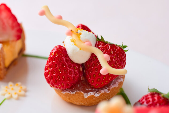 ■(上から)いちごとルバーブのタルト、いちごのムース 「いちごとルバーブのタルト」と「いちごのムース」は、いちごと他の食材とのハーモニーを味わえます。 タルトにはいちごと相性が良くフレッシュで甘酸っぱい香りが特徴のルバーブのコンポートを合わせました。 また、ムースはラズベリーと桜のソースをいちごのムースで包み、一口ごとに織りなす風味の変化を楽しむことができます。