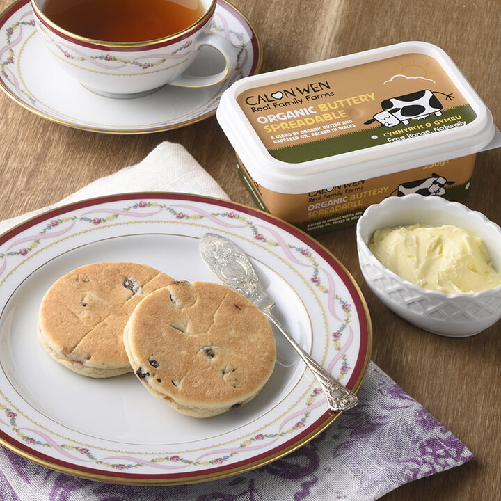 ■PART2〈カロンウェン〉×〈タンカステル〉 ウェルシュケーキとウェルシュスプレタブルバター組み合わせ (スプレタブルバター250g/ウェルシュケーキ6枚入り) ウェルシュケーキは英国ウェールズの伝統菓子です。中はしっとりほくほく、外側はサクサクしたパンケーキ、スコーン、ショートブレッドの食感を併せ持つ独特な優しい甘さのお茶菓子。現地では、温めたウェルシュケーキに有塩バターを塗って食べるのが一般的。農薬を使わない牧草のみを食べてのびのび育った牛の生乳を使って作ったオーガニックの有塩スプレタブルバターは滑らかでミルキーな味わいです。