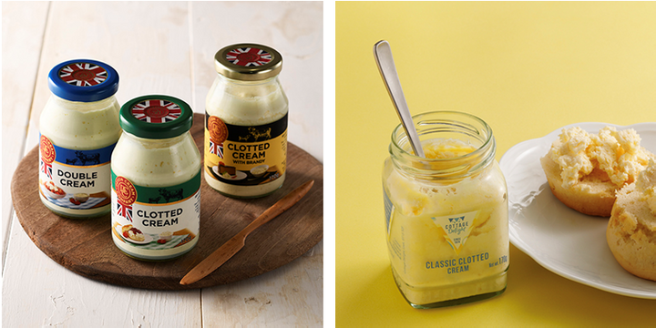■PART1(画像左) 〈チーズ・オン ザ テーブル〉 左:ダブルデボンクリーム ※150点限り/中央:クロテッドクリーム ※200点限り/ 右:クロテッドクリーム ブランデー ※150点限り(各170g) 良質なミルクが採れることで知られている英国デボン州のミルクを使ったデボンクリームカンパニーのクロテッドクリーム。オリジナルの他、ブランデーの香りが広がる「クロテッドクリームブランデー」、乳脂肪分が低く軽い後味の「ダブルデボンクリーム」をラインナップ。 ■PART2(画像右) 〈コッテージデライト〉 クロテッドクリーム (170g)※300点限り 手作業で作るバターファッジ(砂糖菓子)から始まり、ジャム、マーマレードなどを、昔ながらの手法で提供し続けている〈コッテージデライト〉。そんな〈コッテージデライト〉のクロテッドクリームは、リッチでクリーミーな味わい。手間暇かけてゆっくりと少量ずつ作られ、四角い可愛らしい瓶に詰められています。特殊製法により、常温での長期保存も可能。