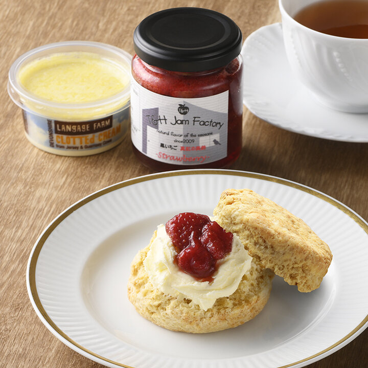 ■PART2 〈プリムローズ〉×〈ダフォディルフーズ〉スコーンとクロテッドクリームとジャムのクリームティーセット ※100セット限り 英国では、スコーン、クロテッドクリーム、ジャム、紅茶のティータイムのことを「クリームティー」と呼びま す。〈プリムローズ〉のいちごのバターミルクスコーンに〈ダフォディルフーズ〉のクロテッドクリームとラズベリージャムをセットにしました。