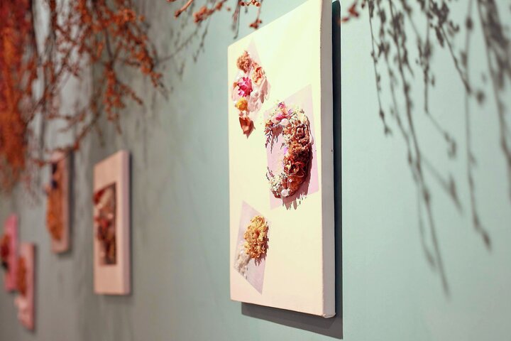 テーブルに添えられた小さなブーケ、ドライフラワーをあしらった絵画のようなキャンバスなど、さまざまなドライフラワーの作品がありますが、どれも購入することができるので、ぜひお気に入りを探してみてください。