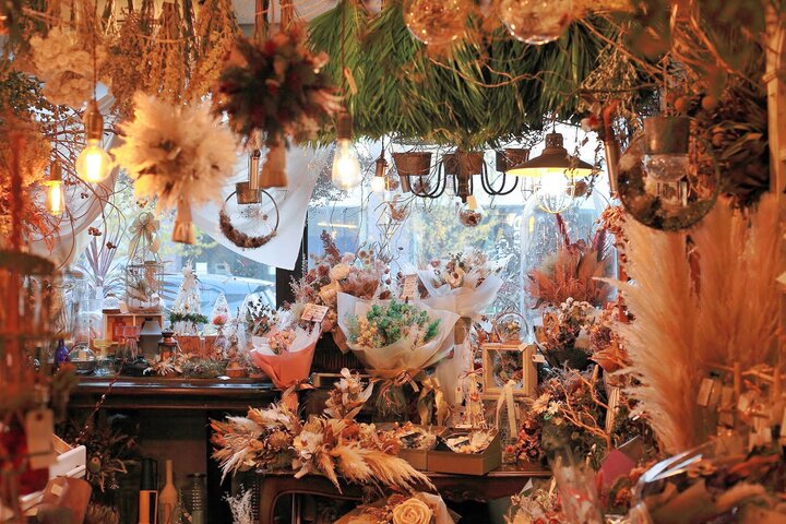 お店の奥は隣に店を構えるドライフラワー専門店「リリカル」とつながっていて、一歩足を踏み入れると、アンティーク色に染まったお花の世界が広がっています。ドライフラワーといっても、カラフルなものもあり、生花にはない優しい色合い。好みの雰囲気や入れたいお花をリクエストしてオリジナルのブーケをオーダーすることもできます。