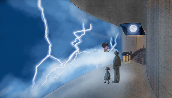 展覧会は、映像をひとつのスクリーンで座って見る鑑賞スタイルではなく、154 分のアニメーションを、大空間を歩きながら体感していきます。 光と色にあふれた映像美は、複数のスクリーンと自然を感じる音響とで味わいます。「おなり」と「なりどん」がたわむれるあたたかな光や美しい自然描写、憧れの雷神と空を浮遊する雷雲のシーン、「おなり」が人間社会と迷いの森をさまようシーン、「おなり」と仲間たちが勇気を出して ONI に立ち向かうクライマックスシーンなどが会場全体を包みます。