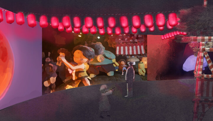 会場には、壁面と特製の手漉き和紙スクリーンに映像を投影。作品の世界を全身で感じられる臨場感を再現します。 また、和紙と竹ひごでつくられた提灯が、会場のあちこちを照らします。物語に出てくる戻り橋や灯籠、祭りやぐらを再現展示するほか、会場の随所には、日本全国から蒐集された鬼や妖怪のお面、大きな凧が展示されます。日本の古き良きものづくりや質感と作品の映像美とが渾然一体となり、まるで異空間へトリップしたような体験となります。