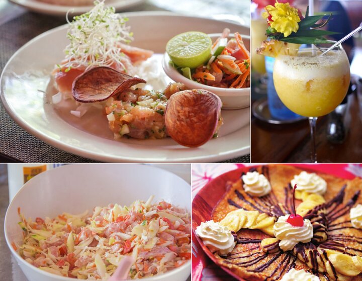 (左上から時計回りに)美しい盛り付けのレストランの料理 ©Lei Tao、モーレア島産パイナップルのジュース ©エア タヒチ ヌイ、ルロット(移動式屋台)のクレープ、郷土料理ポワソン・クリュ ©Teriitua Maoni