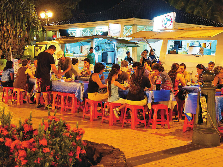そんなタヒチで地元の人に大人気なのが「ルロット」と呼ばれる移動式屋台です。町中のレストランよりもリーズナブルにさまざまな料理が楽しめるのが特徴。モーレア島行きのフェリー乗り場に近いバイエテ広場には、イタリアン、ピザ、中華、クレープなどバラエティ豊かな屋台が集まり、18時頃から24時頃まで大勢の人でにぎわいます。旅の思い出に地元の人に交じってルロットを楽しんでみてはいかがですか。