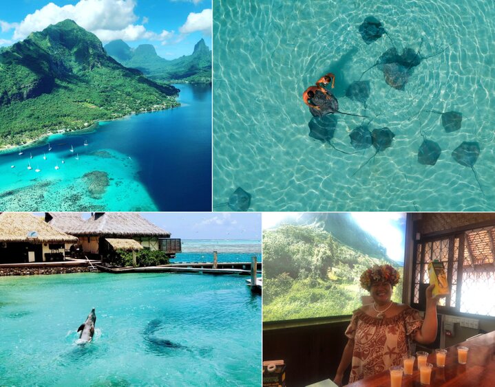 (左上から時計回りに)モーレア島のラグーン ©エア タヒチ ヌイ、モツピクニックでエイの餌付け体験 ©InterContinental Hotels&Resorts French Polynesia、フルーツジュース工場、ドルフィンセンター ※2枚とも©エア タヒチ ヌイ