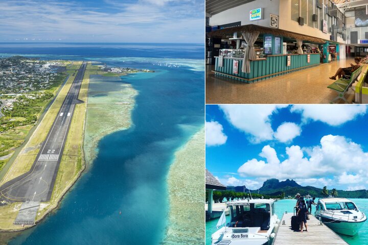(左から時計回りに)ラグーンのそばにある滑走路 ©Grégoire Le Bacon、ファアア国際空港、ボラボラ空港 ※2枚とも©エア タヒチ ヌイ
