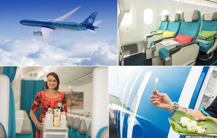(左上から時計回りに)美しいブルーの機体、エコノミークラス、搭乗時にティアレの生花をプレゼント、機内食はタヒチアンドレスでサービス ※すべて©エア タヒチ ヌイ