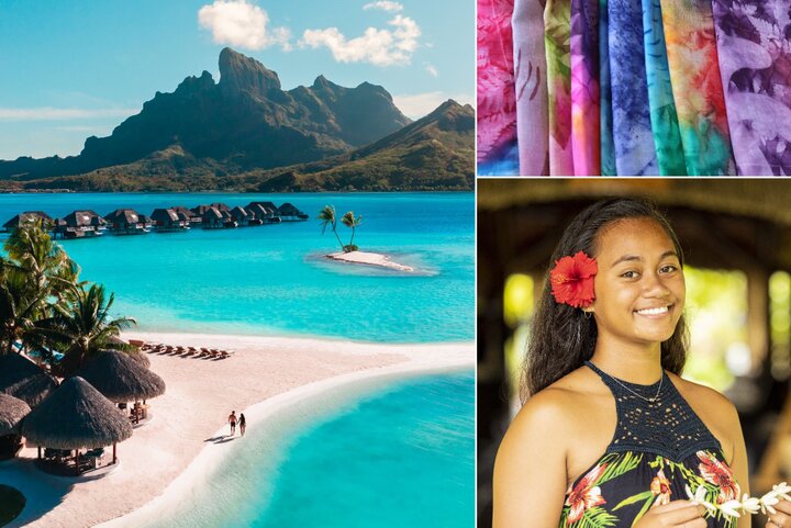 (左から時計回りに)静かな時間が流れるボラボラ島 ©Jeremy Austiin、タヒチ伝統の布地パレオ ©Tumata Vairaaroa、温かいおもてなしも魅力のひとつ ©Grégoire Le Bacon