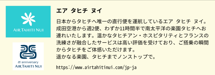 いかがでしたか? 直行便が再開する10月末、緑が色濃くなり、海はさらに蒼く、花々が咲き誇るより南国らしいシーズンを迎えるタヒチへ行ってみませんか。 水上バンガローといえばモルディブのイメージもありますが、タヒチは日本から直行便で行けること、ホテルリゾート以外でも町歩きやレストランでの食事が楽しめること、おもてなしの精神にあふれる陽気なタヒチの人々との交流を楽しんだり、タヒチアンダンスなどの伝統的な文化に触れられるなど、多彩な魅力にあふれています。一度行ったらまた帰りたくなる、地上の楽園・タヒチをぜひ体感してみてください。
