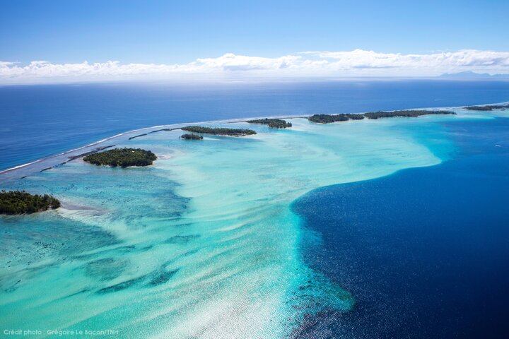 美しいラグーンに点在するタヒチの島々 ©Grégoire Le Bacon Tahiti Nui Helicopters