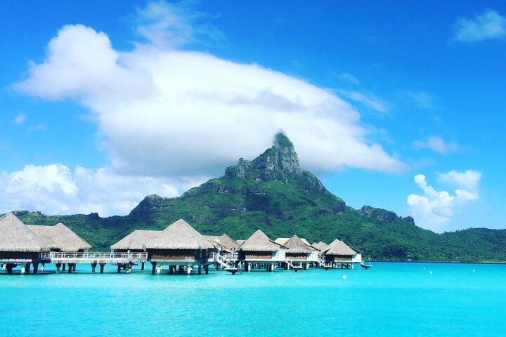 タヒチの島々のなかでもとくに美しいとされるボラボラ島。島の周りにはブルーグリーンのラグーンが広がり、中央には神々しいオテマヌ山がそびえ立つ神秘的な光景は息をのむ美しさです。