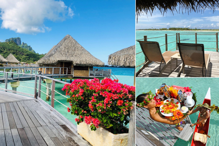 (左から時計回りに)1棟1棟独立した水上バンガロー、水上バンガローのテラスからの眺め ※2枚とも©エア タヒチ ヌイ、カヌーブレックファスト ©Le Taha’a