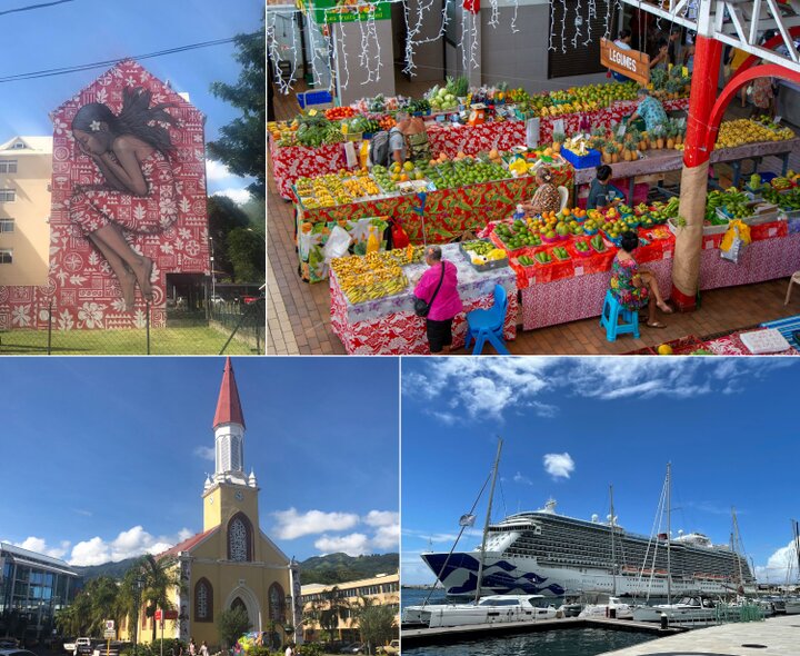 (左上から時計回りに)町中のウォールアート ©エア タヒチ ヌイ、マルシェ ©Massimiliano Cinà、パペーテ港、カテドラル ※2枚とも©エア タヒチ ヌイ