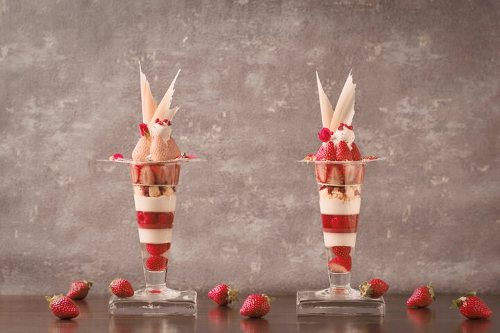 「大宮アートグレイス ウエディングシャトー/大宮璃宮」館内の「カフェ&レストラン 四季庭」では、好評販売中の「ご褒美パフェショコラ 狭山茶ソース」「うさみみストロベリーパフェwithハーゲンダッツ」を、当初予定していた販売期間より2週間延長し、2023年2月27日まで販売しています。 「ご褒美パフェショコラ 狭山茶ソース」は、ベルギー産チョコレート「ベルコラーデ」を使用し、サクサクのマカロンやチョコレートクリームをはじめ、様々な食感のチョコレートをふんだんに堪能できる平日限定のご褒美パフェ。 グラス内部はチョコと相性の良いオレンジやゼリー、アイスクリームで構成され、さっぱりといただけます。別添えで提供される埼玉県産の狭山茶ソースで味の変化をつけながら堪能して。 また、2023年の干支“うさぎ”の耳のようにぴょこんと飛び出たチョコ細工がキュートな「うさみみストロベリーパフェwithハーゲンダッツ」も登場。王道の「赤いちご」バージョンと高級「白いちご」のプレミアムバージョン(写真左)の2種類の食べ比べも楽しめます。