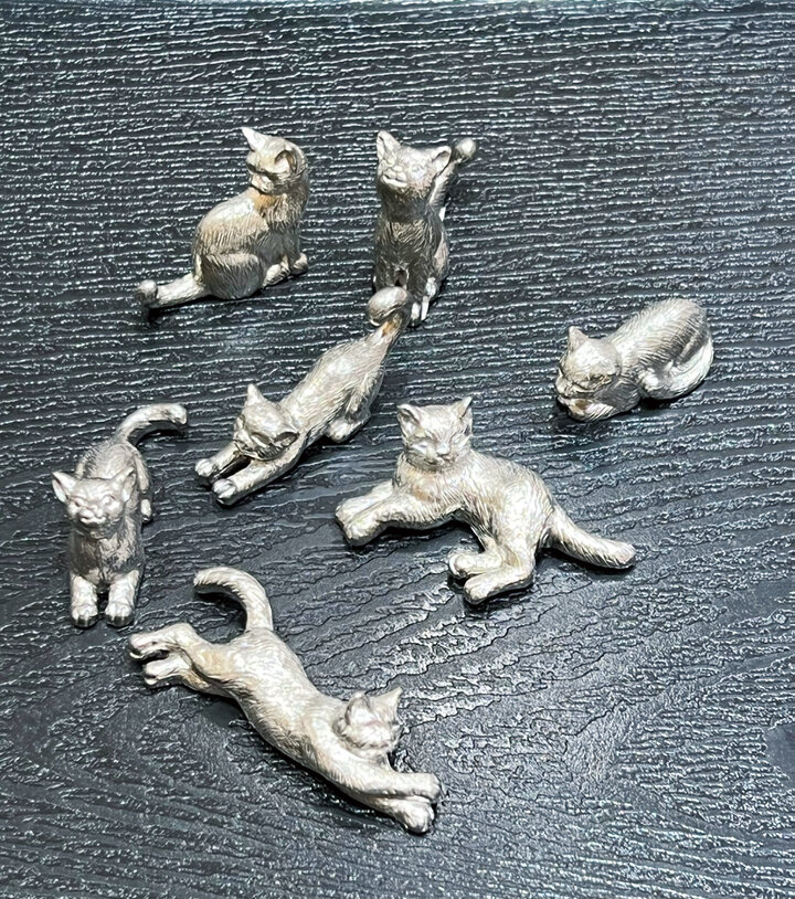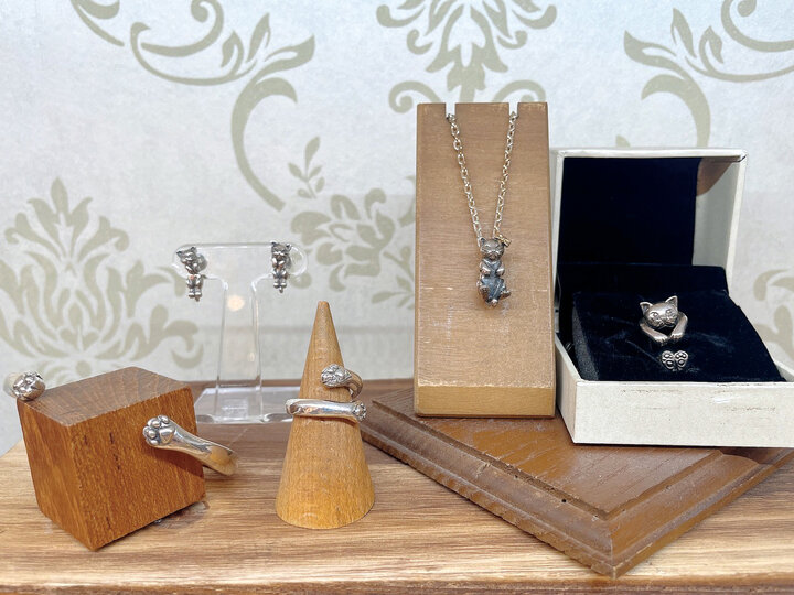 写真左上から 1:猫ピアス 2:猫ネックレス 3:猫リング 写真左下から 4:肉球バングル 5:肉球リング <ムーラ ヴェール>(イーストヤード4階) ※通年販売商品 猫をモチーフにした手作りのシルバーアクセサリー。バングルとリングは肉球をイメージしたデザインです。